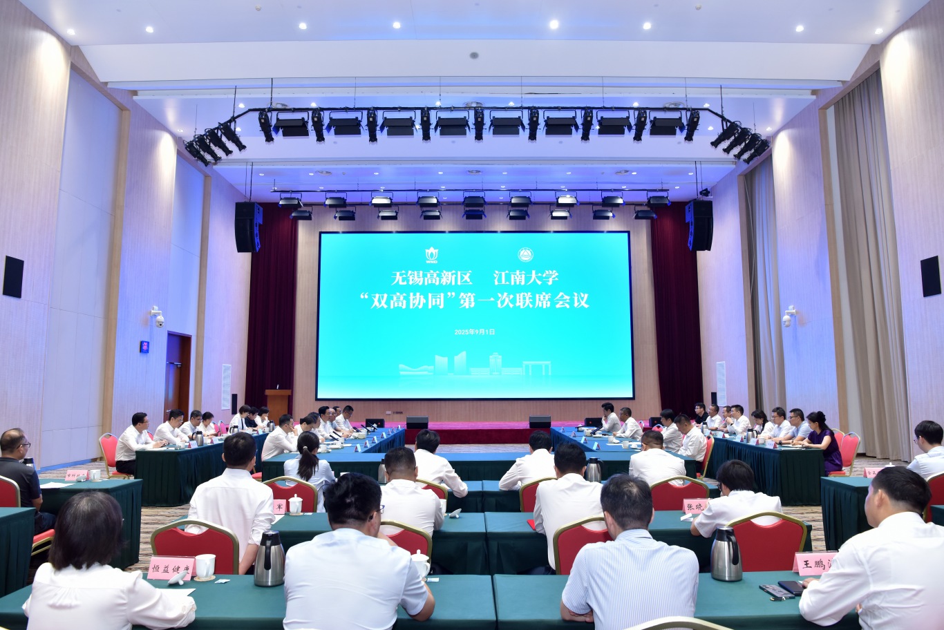 9月1日,学校与无锡高新区召开“双高协同”第一次联席会议。中国工程院院士、校长陈卫,无锡高新区党工委书记、区委书记崔荣国,市科技局副局长朱华章出席会议并讲话。校党委副书记倪松涛,党委常委、副校长马鑫,党委常委、组织部部长张梁,无锡高新区区领导顾国栋、钱怡、阙尧尧、孙磊、李桂林、徐东,以及学校相关部门、重点学科、高新区重点企业和机构等共70余名代表出席会议。