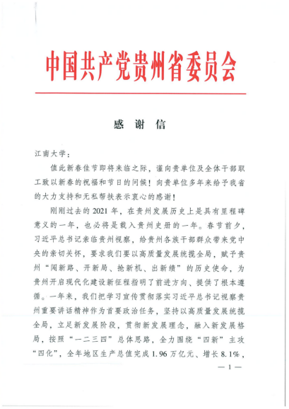 近日,贵州省委向我校发来感谢信,对我校在贵州省从江县开展的教育帮扶、产业帮扶、消费帮扶等定点帮扶工作予以高度肯定,并对学校多年来给予贵州省的大力支持和无私帮扶表示感谢。
