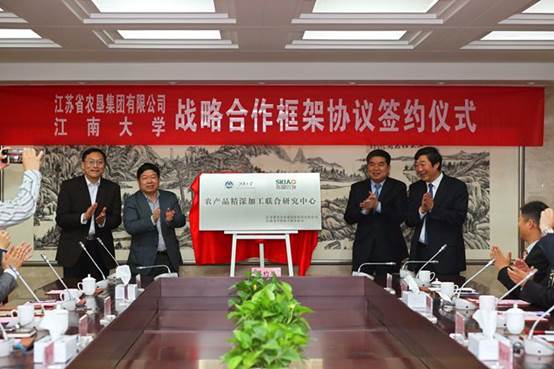 随后,吴正国副校长与江苏省农垦集团有限公司总经理胡兆辉共同签署校企战略合作框架协议;粮食发酵工艺与技术国家工程实验室教授陈正行和江苏省农垦农业发展股份有限公司总裁苏志富共同签署农产品精深加工联合研究中心合作协议;陈坚校长、吴正国副校长和魏红军书记、胡兆辉总经理共同为联合研究中心揭牌。