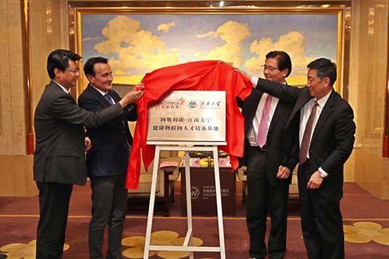黄钦市长、朱拓书记、Pascal Soriot首席执行官、王进健副市长共同为“江南大学-阿斯利康健康物联网人才基地”揭牌