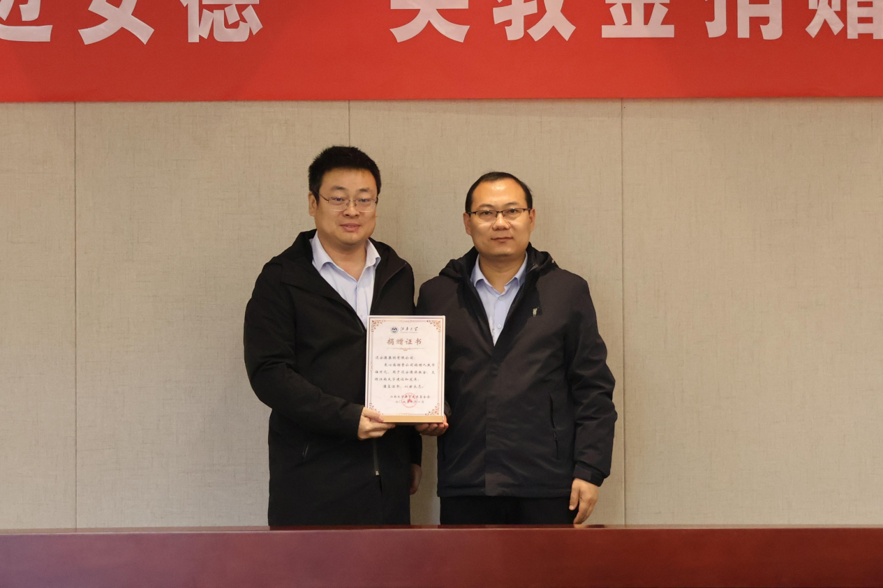 任增亮向两家企业颁授捐赠证书,以表彰其对我校教育事业的大力支持。项光辉和徐国伟分别上台接受证书并合影留念。